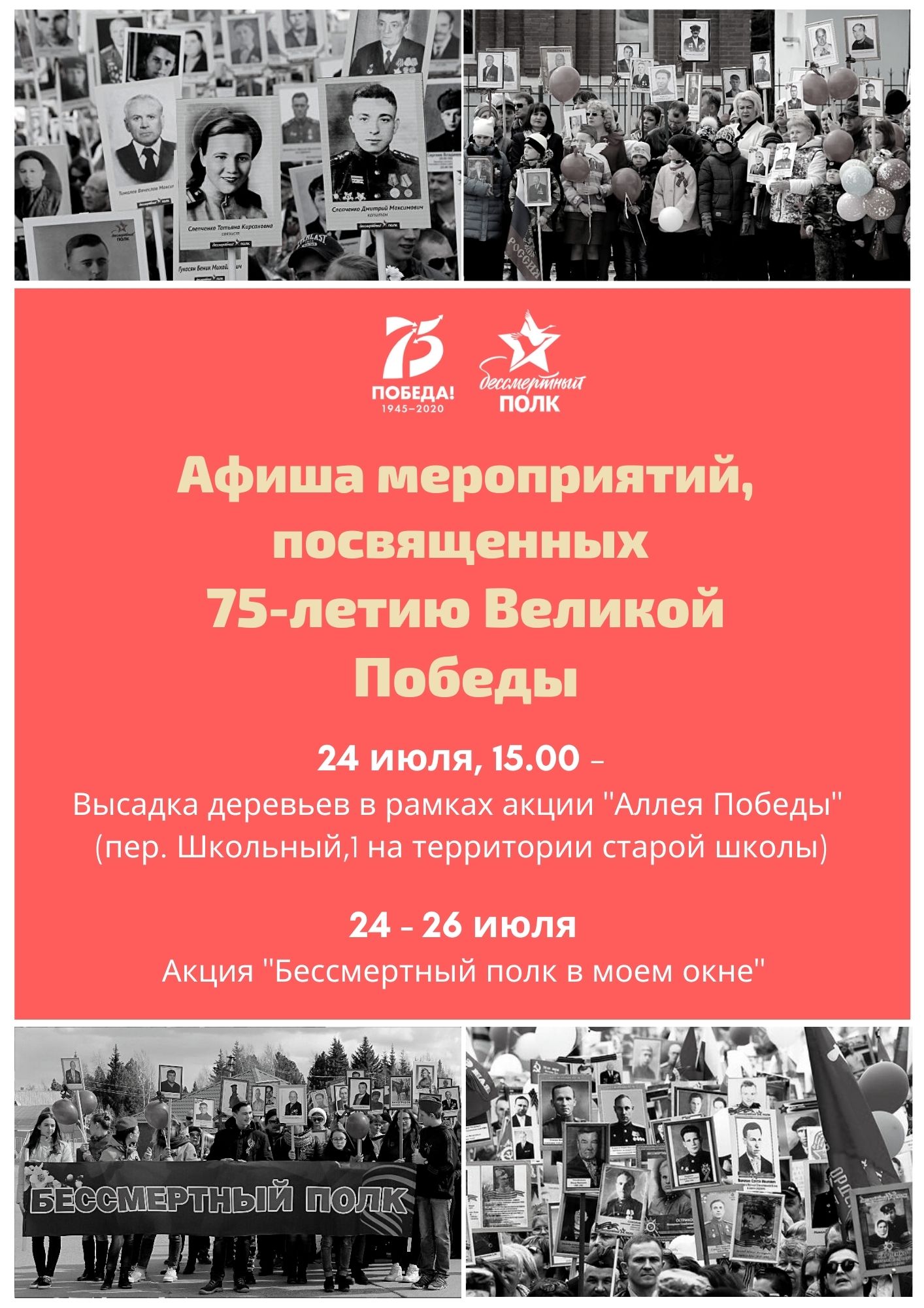 24 июля, 15.00 - Высадка деревьев в рамках акции "Аллея Победы" (пер. Школьный,1 на территории старой школы) 24 - 26 июля Акция "Бессмертный полк в моем окне"