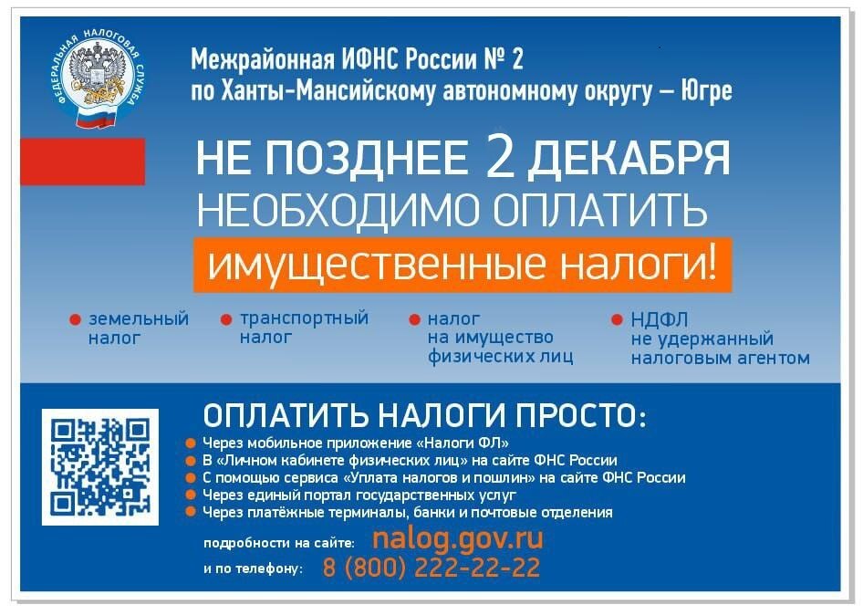Также информируем о необходимости осуществления оплаты имущественных налогов (налог на имущество физических лиц, транспортный налог, земельный налог) за 2023 год до установленного срока уплаты 02.12.2024