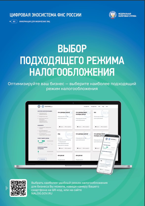 Выбрать наиболее удобный режим налогообложения для бизнеса Вы можете, наведя камеру Вашего смартфона на QR-код, или на сайте NALOG.GOV.RU