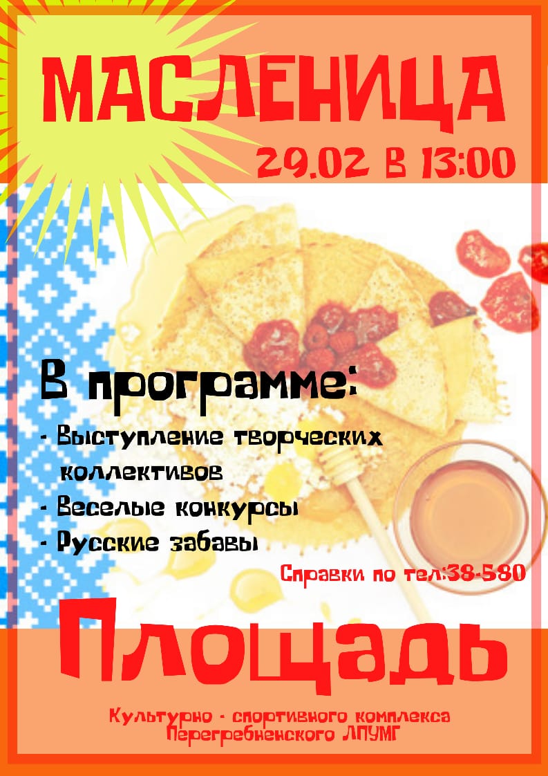 29 февраля в 13:00 на площади культурно-спортивного комплекса Перегребненского ЛПУ МГ празднование Масленицы! Справки по тел.: 38-580.